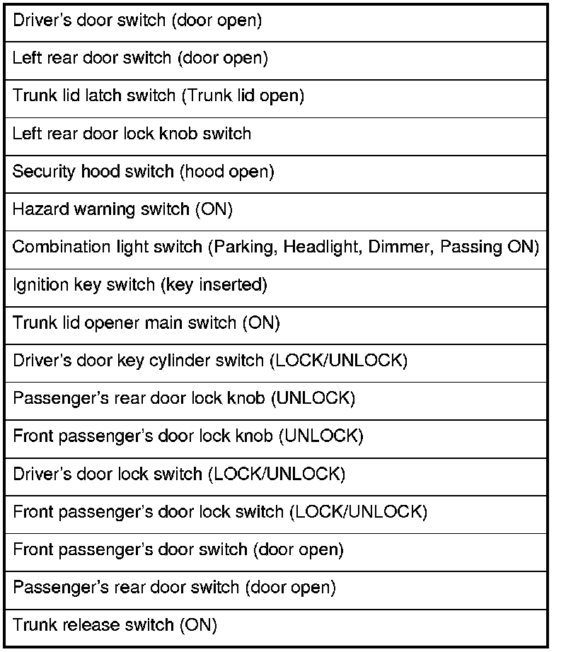 NOTE: If any control unit is faulty and will not wake up, several circuits in the system will malfunction at the same time. In the table below, is a list of the switches and input signals that wake them up.