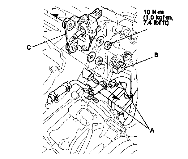 1. Disconnect the hoses (A) and the EVAP canister purge valve 2P connector (B).