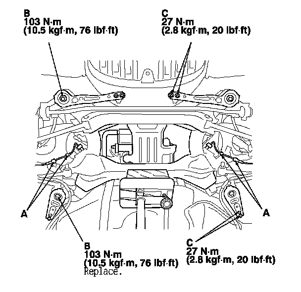 4. Remove the rear subframe mounting bolts (B, C).