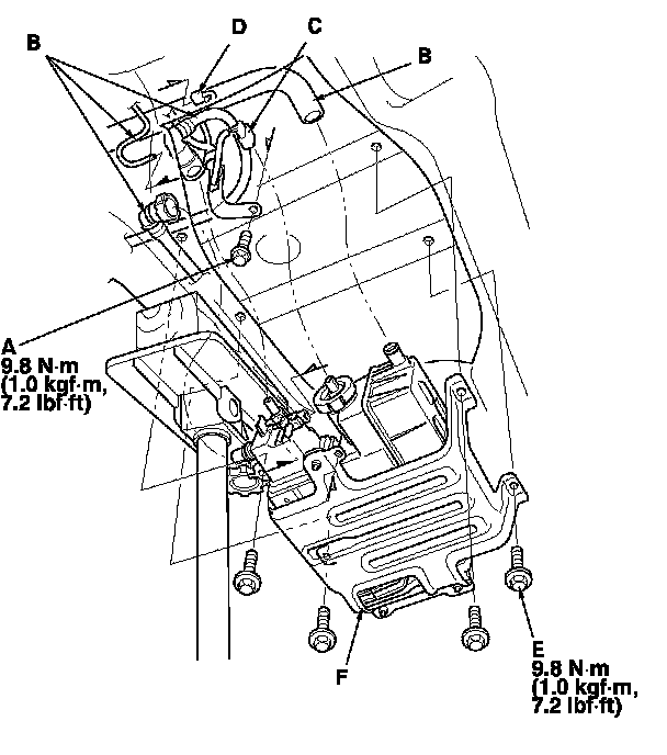 7. Remove the bolts (E), then remove the EVAP canister assembly (F).