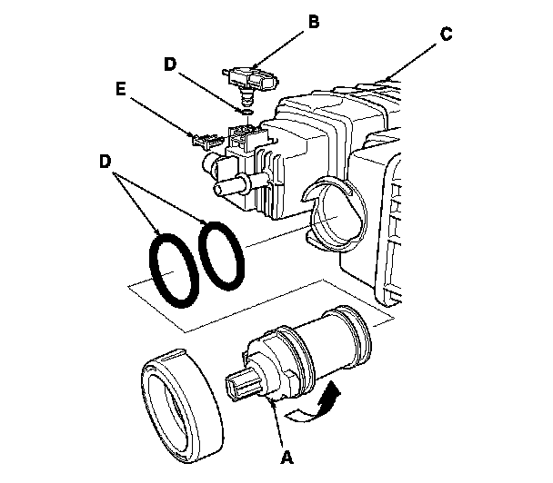 10. Reassemble the EVAP canister with new O-rings (D) and a new retainer (E), then install the EVAP canister bracket.
