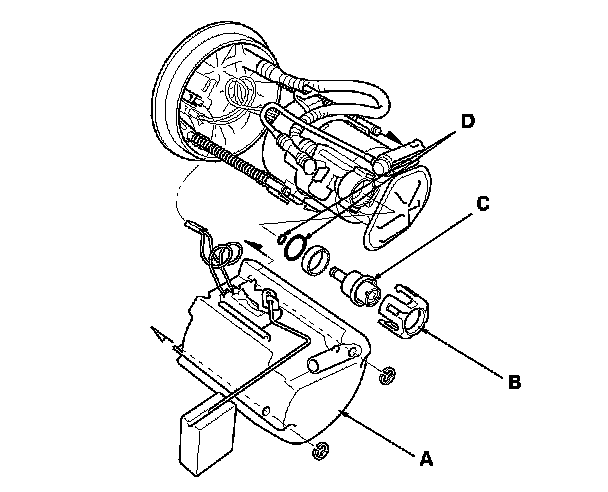5. Install the parts in the reverse order of removal with new O-rings (D) and a new bracket. When installing the fuel tank unit, align the marks on the unit and the fuel tank. Fuel Tank Unit Removal/Installation