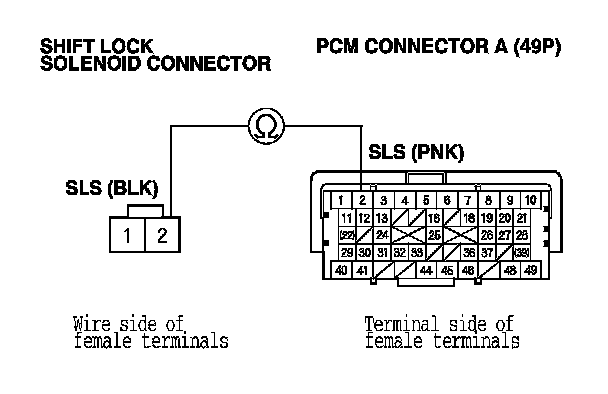 15. Check for continuity between PCM connector terminal A2 and shift lock solenoid connector terminal No. 2.