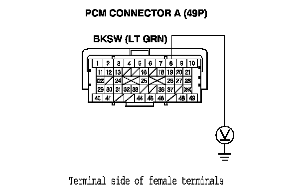 20. Measure the voltage between PCM connector terminal A8 and body ground while pressing the brake pedal and when the brake pedal is released.