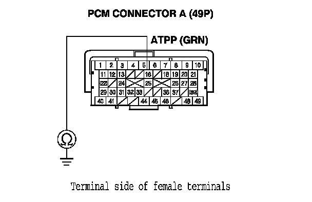 31. Check for continuity between PCM connector terminal A16 and transmission range switch connector terminal No. 7.