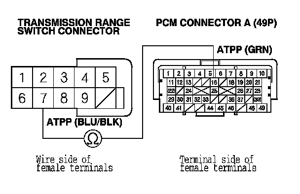 NO - Repair open in the wire between PCM connector terminal A16 and the transmission range switch connector.