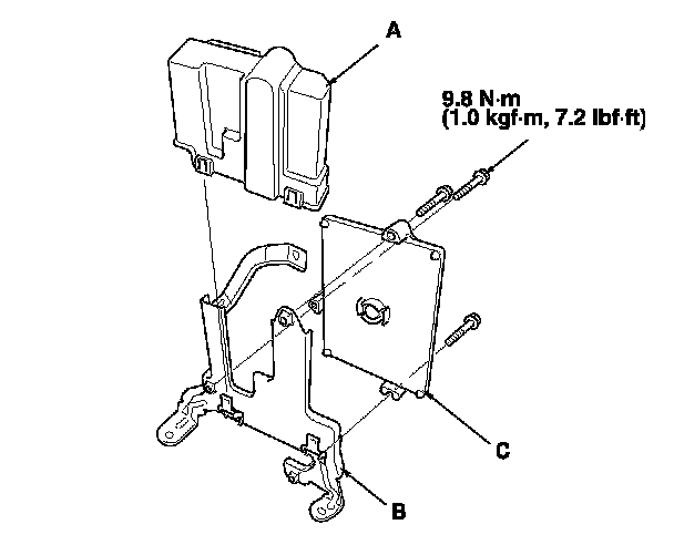 15. Disconnect the cover (A) and the bracket (B) from the PCM (C).