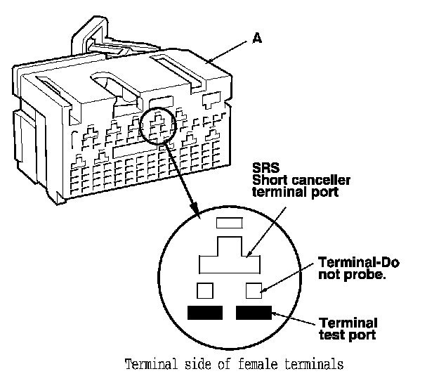 When diagnosing or troubleshooting at an SRS unit connector (A), use the terminal test port below the terminal you need to check. Gently insert the pin probes of the tester or jumper wire at the terminal test port from the terminal side.
