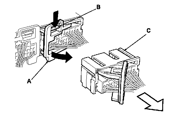 To release the lock, pull the lever (A) while pushing the lock (B), on the outside of the connector, then pull out the connector (C).