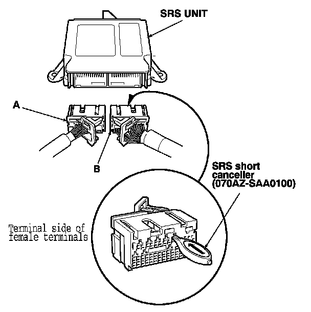 When SRS unit connector A (39P) or B (39P) is disconnected, a short circuit is created in the connector to prevent accidental deployment of an airbag or tensioner. The circuit may need to be opened when diagnosis is done on the system. Insert a SRS short canceller (070AZ-SAA0100) in the specified cavities when is necessary to keep the circuit open for diagnosis.