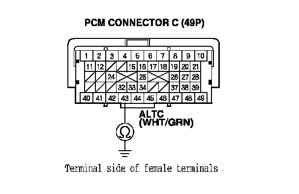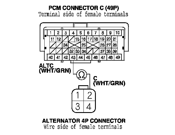 14. Check for loose terminals and connectors, then check for continuity between PCM connector terminal C43 and alternator 4P connector terminal No. 2.
