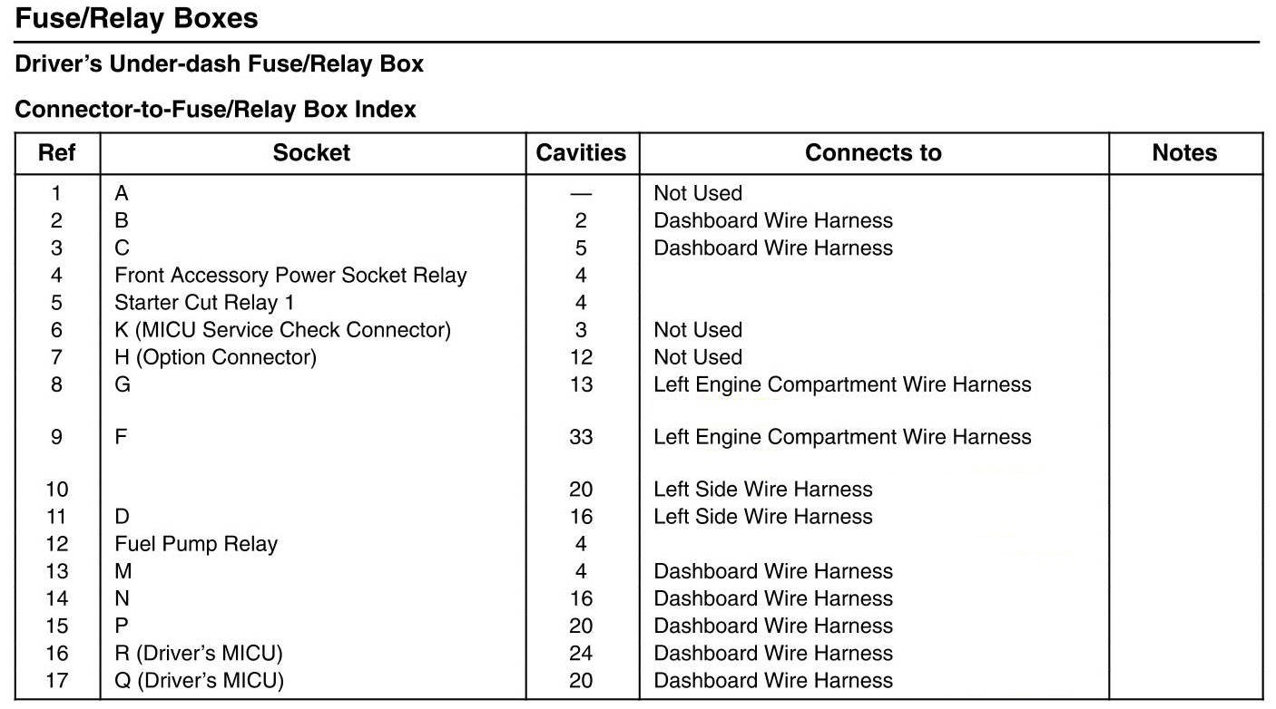 Driver's Under-dash Fuse/Relay Box - Connector-to-Fuse/Relay Box Index