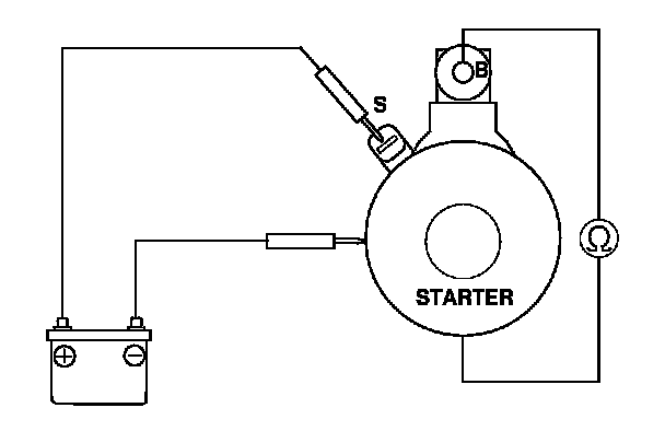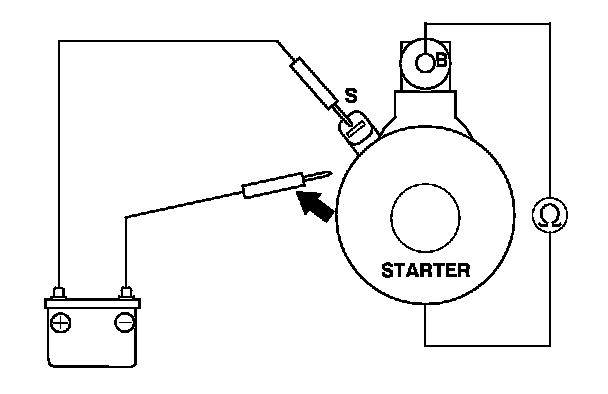 4. Connect the battery as shown, and check for continuity between the B terminal and the starter body. If there is continuity, it is working properly.