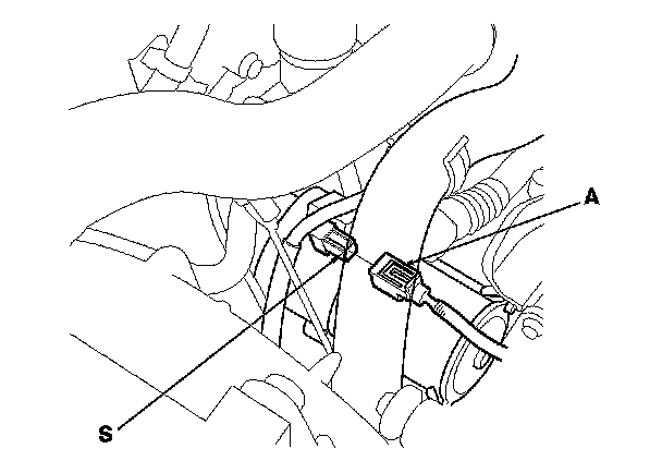 11. Make sure the shift lever is in N or P, then disconnect the connector (A) from the starter S terminal. Connect a jumper wire from the battery positive terminal to the S terminal.