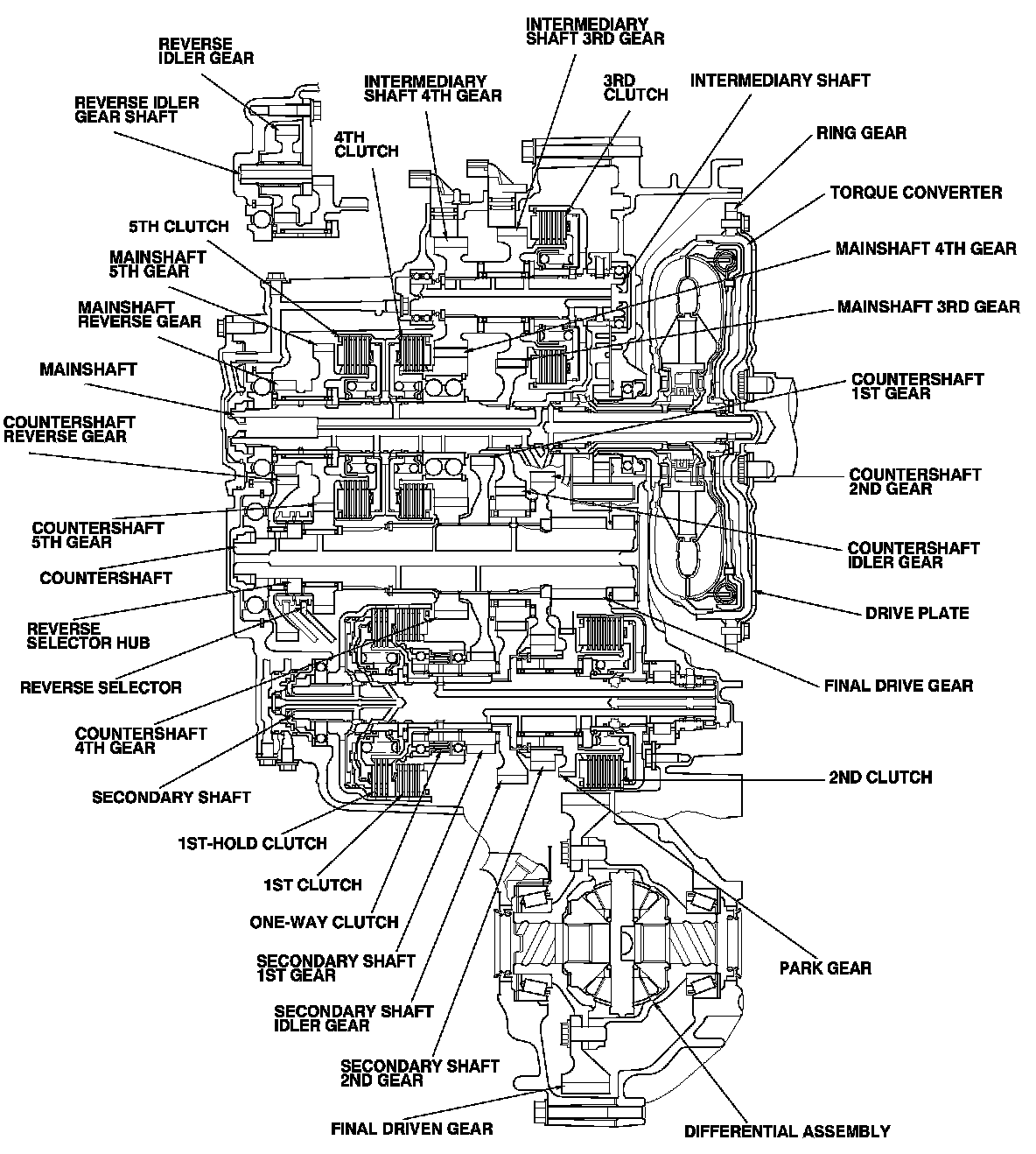 The one-way clutch is positioned between the 1st clutch hub and the secondary shaft 1st gear. The secondary shaft 1st gear is splined to the 1st-hold clutch hub, with the 1st-hold clutch hub splined to the secondary shaft. The secondary shaft 1st gear provides the outer race surface, and the 1st clutch hub provides the inner race surface. The one-way clutch locks when power is transmitted from the secondary shaft 1st gear to the countershaft 1st gear. The 1st clutch and gears remain engaged in the 1st, 2nd, 3rd, 4th, and 5th gear ranges in D or S.
