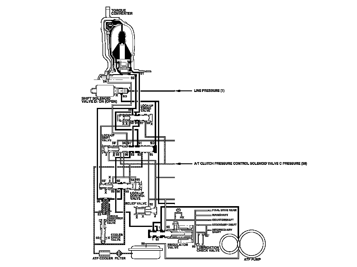 As the speed of the vehicle reaches the programmed value, the PCM turns shift solenoid valve D ON, and shift solenoid valve D uncovers the shift solenoid valve D pressure port (SD) to the lock-up shift valve. The lock-up shift valve is moved to the left side which uncovers the torque converter pressure port (91) leading to the right side of the torque converter to engage the torque converter clutch. The PCM also actuates A/T clutch pressure control solenoid valve C, and A/T clutch pressure control solenoid valve C pressure (58) is applied to the lock-up control valve and the lock-up timing valve. When A/T clutch pressure control solenoid valve C pressure (58) is low, torque converter pressure (91) from the lock-up timing valve is low. The torque converter clutch is engaged partially. A/T clutch pressure control solenoid valve C pressure (58) increases, and the lock-up timing valve is moved to the left side to uncover the torque converter pressure port leading to high. Under this condition, the torque converter clutch is engaged by pressure from the right side of the torque converter; this condition is partial lock-up.