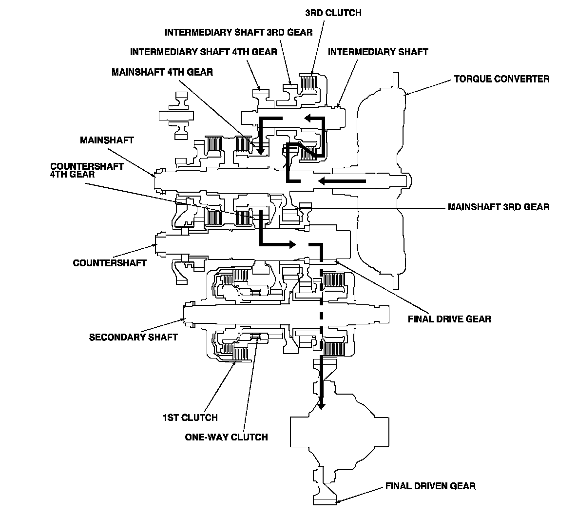 - Hydraulic pressure is applied to the 3rd clutch, then the 3rd clutch engages the intermediary shaft 3rd gear with the intermediary shaft.