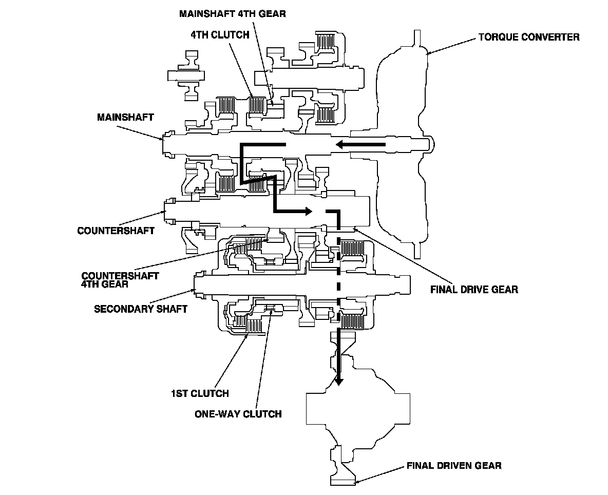 - Hydraulic pressure is applied to the 4th clutch, then the 4th clutch engages the mainshaft 4th gear with the mainshaft.