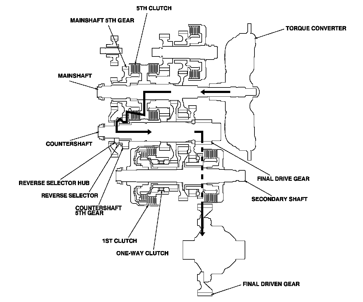 - Hydraulic pressure is applied to the 5th clutch, then the 5th clutch engages the mainshaft reverse gear with the mainshaft.