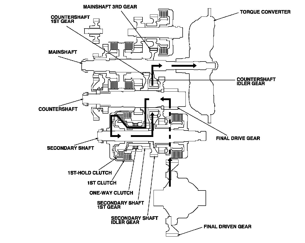 - Hydraulic pressure is applied to the 1st clutch, then the 1st clutch engages the secondary shaft 1st gear with the secondary shaft by the one-way clutch.