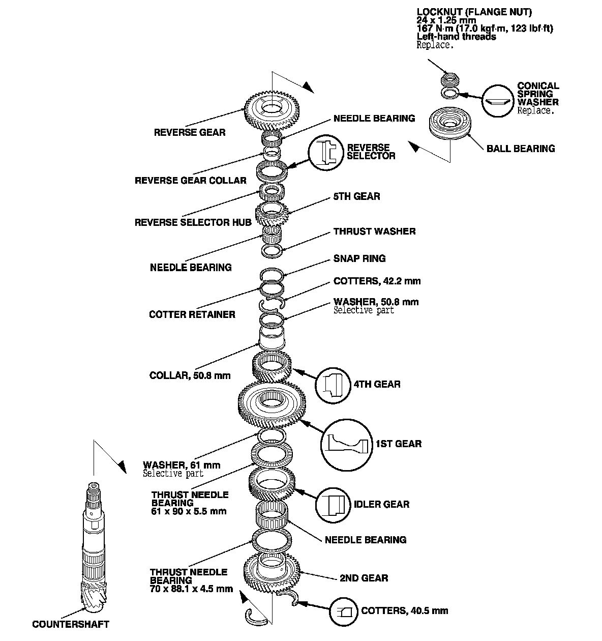 2. Hold the countershaft securely using a wrench and a vise, loosen the locknut, and remove it. The locknut has left-hand threads.