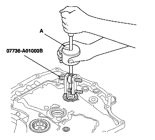 1. Remove the intermediary shaft bearing from the torque converter housing using the 25-40 mm adjustable bearing puller and a commercially available 3/8''-16 slide hammer (A).