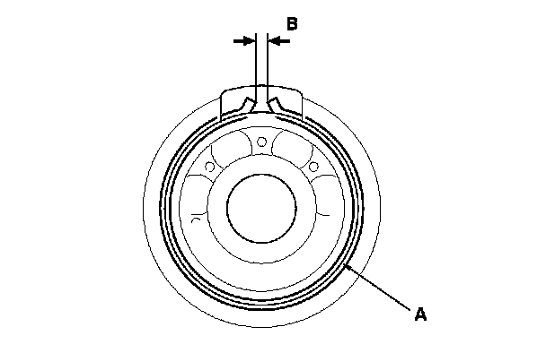 4. After installing the bearing, check that the snap ring (A) is seated in the bearing and housing groove, and that the snap ring end gap (B) is 0-7 mm (0-0.28 in).
