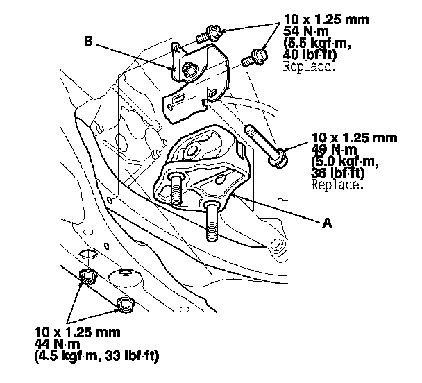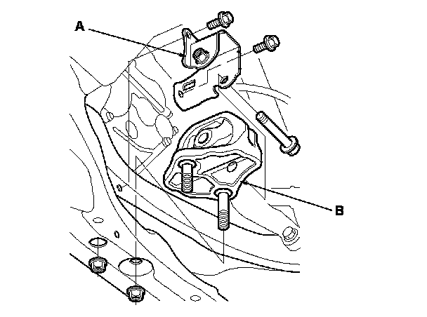 2. Remove the lower transmission mount bracket (A), then remove the lower transmission mount (B).