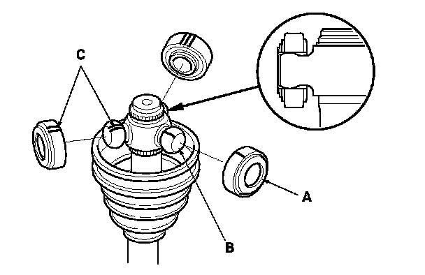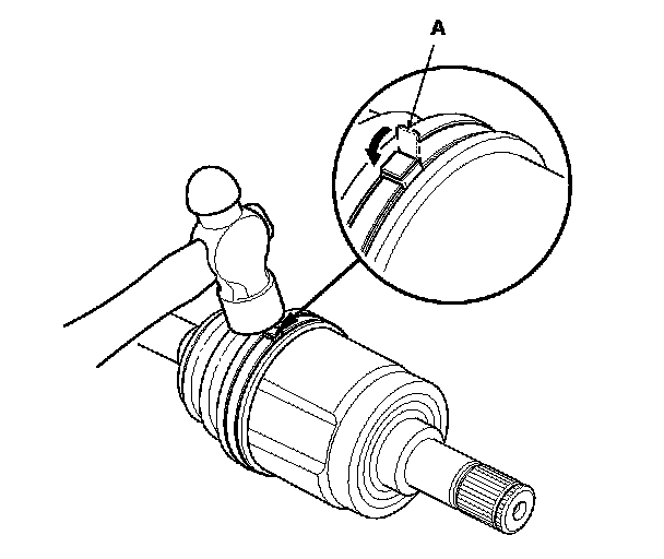 - Reinstall the inboard joint onto the driveshaft by aligning the marks (A) you made on the inboard joint and the rollers.