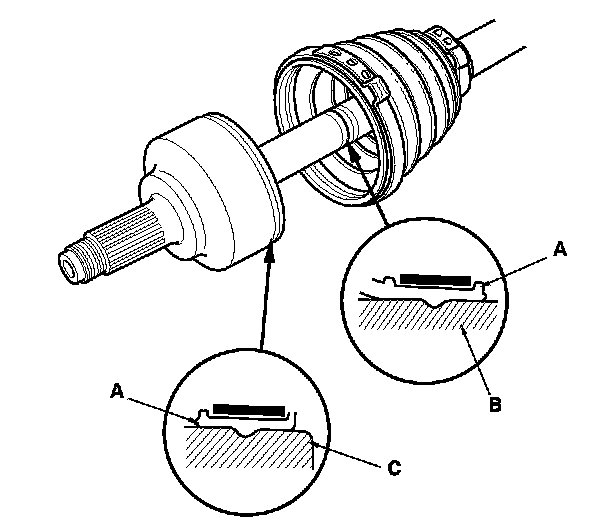 8. Fit the boot ends (A) onto the driveshaft (B) and the inboard joint (C).