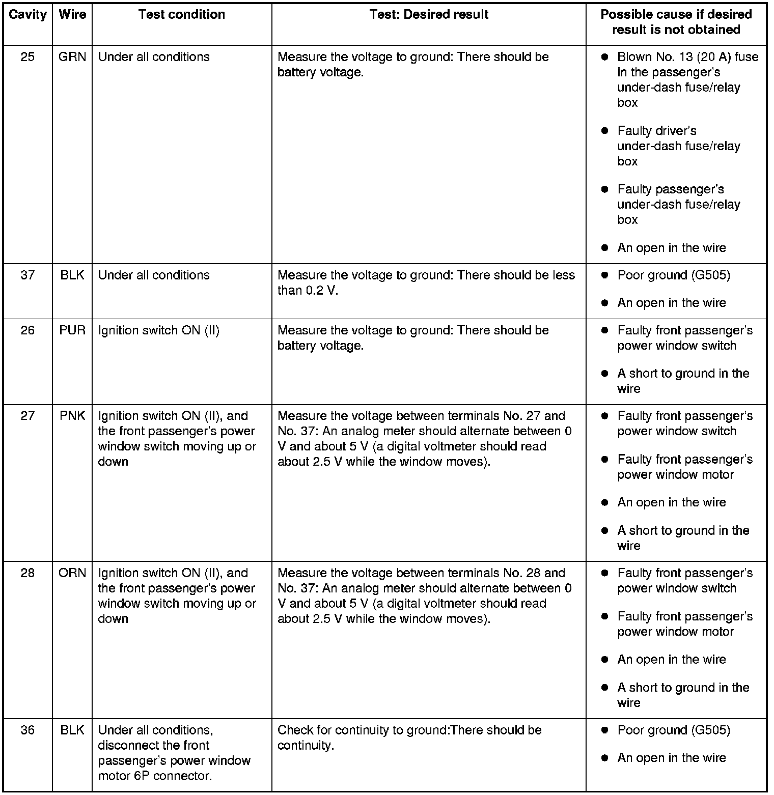 5. Reconnect the connector to the front passenger's power window switch, turn the ignition switch to ON (II), and do these input tests at the following connector.
