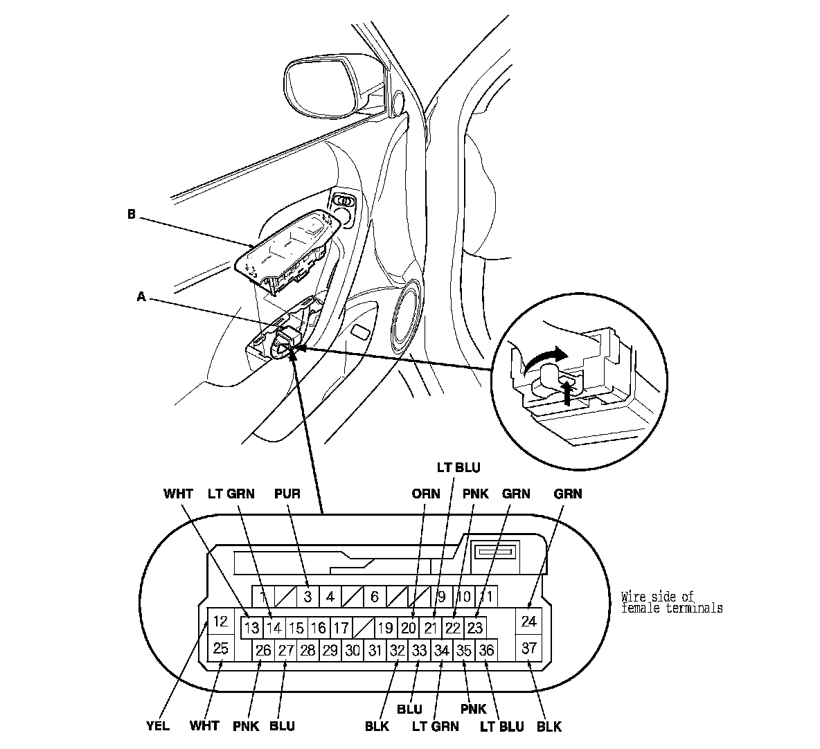 2. Disconnect the 37P connector (A) from the power window master switch (B).