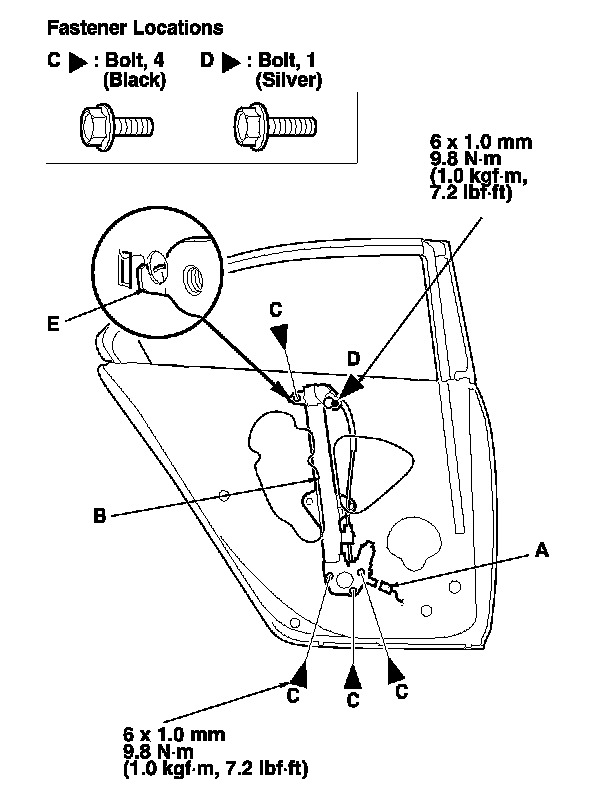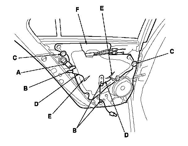 14. Remove the bolts (C), and loosen the bolt (D). Release the hook (E), then remove the regulator through the hole in the door.