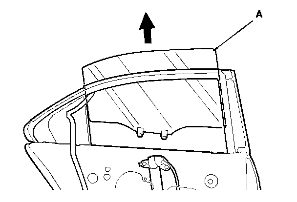 12. Remove the quarter glass (A). Take care not to damage the door glass outer weatherstrip (B).