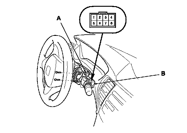 2. Disconnect the dashboard wire harness 8P connector (A) from the wiper/washer switch (B).