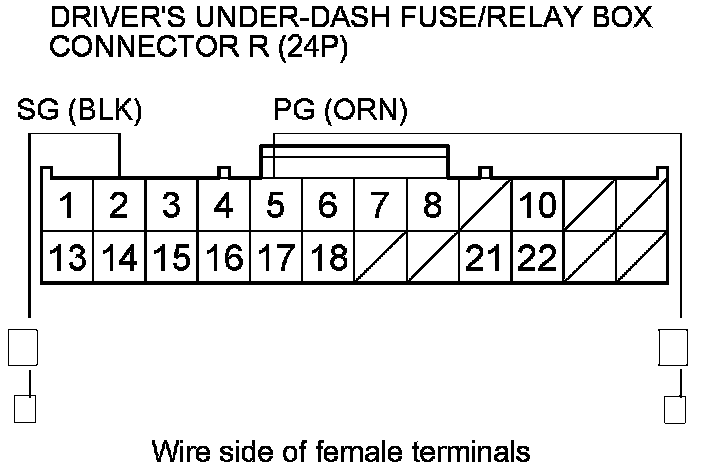 8. Measure the voltage between body ground and driver's under-dash fuse/relay box connector Q (20P) terminals No.1 and No. 2, and between body ground and connector R (24P) terminals No. 2 and No. 5 individually.