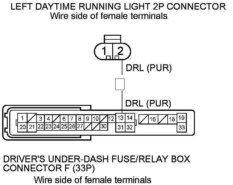 14. Check for continuity between driver's under-dash fuse/relay box connector F (33P) terminal No. 13 and left daytime running light 2P connector terminal No. 2.