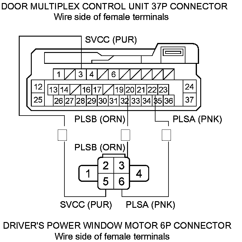 10. Check for continuity between terminals No. 3,No. 20, and No. 22 of door multiplex control unit 37P connector and terminals No. 5,No. 3, and No. 6 of the driver's power window motor 6P connector respectively.
