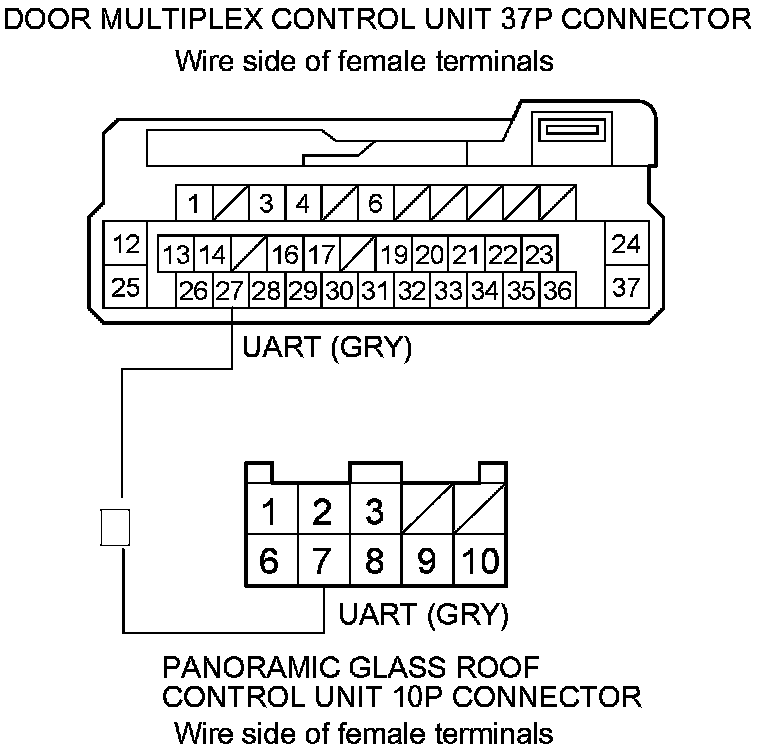 8. Check for continuity between power window master switch 37P connector terminal No. 27 and panoramic glass roof control unit 10P connector terminal No. 7.