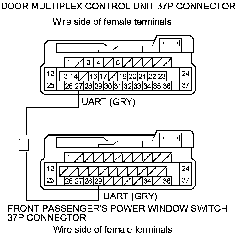 10. Check for continuity between door multiplex control unit 37P connector terminal No. 27 and front passenger's power window switch 37P connector terminal No. 29.