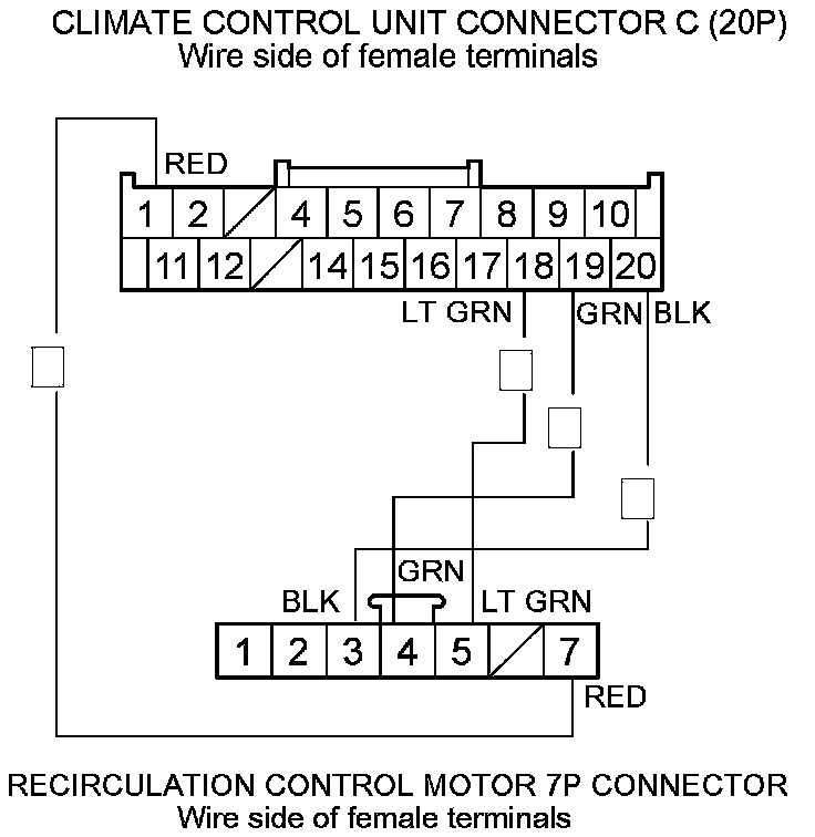 Check for loose wires or poor connections at climate control unit connector C (20P) and at the recirculation control motor 7P connector. If the connections are good, substitute a known-good climate control unit, and recheck. If the symptom/indication goes away, replace the original climate control unit Service and Repair.�