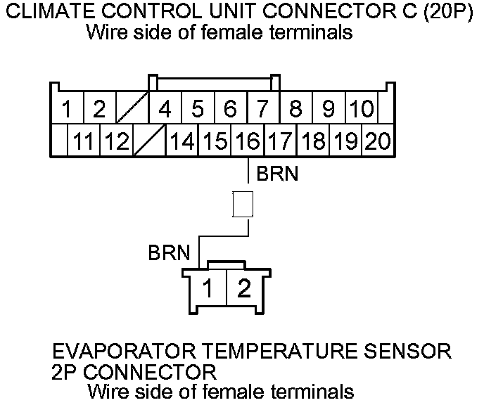 8. Check for continuity between climate control unit connector C (20P) terminal No. 16 and evaporator temperature sensor 2P connector terminal No. 1.