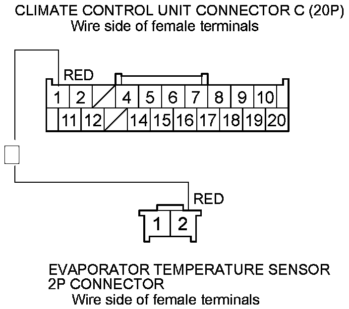 9. Check for continuity between climate control unit connector C (20P) terminal No. 1 and evaporator temperature sensor 2P connector terminal No. 2.