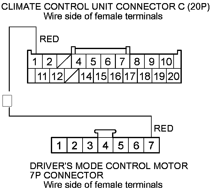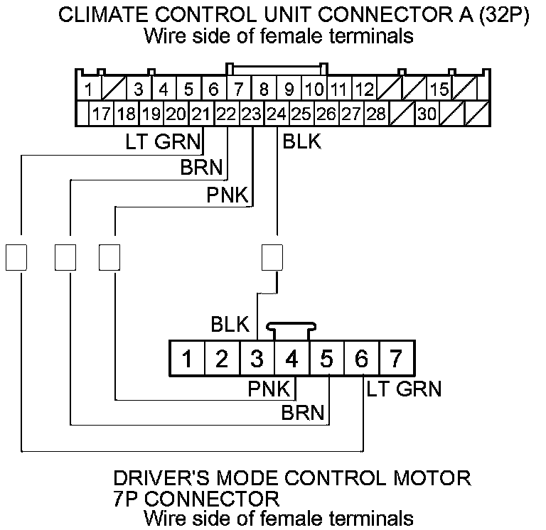 9. Check for continuity between the following terminals of climate control unit connectors A (32P), C (20P) and the driver's mode control motor 7P connector.