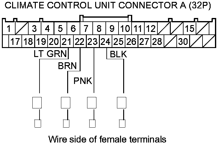10. Check for continuity between body ground and climate control unit connector A (32P) terminals No. 21,No. 22,No. 23, and No. 24 individually.