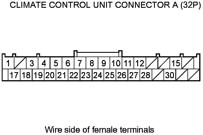 11. Check for continuity between climate control unit connector A (32P) terminals as follows.