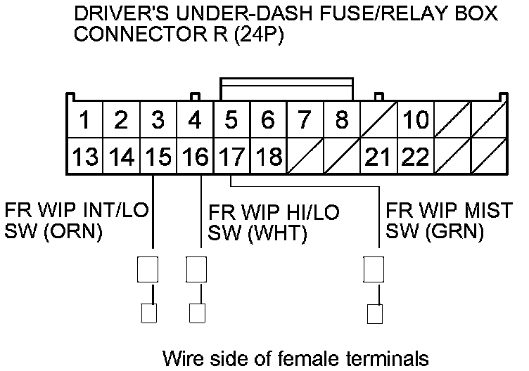 16. Check for continuity between body ground and driver's under-dash fuse/relay box connector R (24P) terminals No. 15,No. 16, and No. 17 individually.