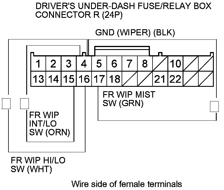 9. Check for continuity between driver's under-dash fuse/relay box connector R (24P) terminals as shown: