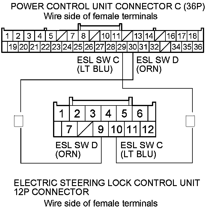 8. Check for continuity between power control unit connector C (36P) terminals No. 29 and No. 30, and electric steering lock 12P connector terminals No. 10 and No. 9 respectively.
