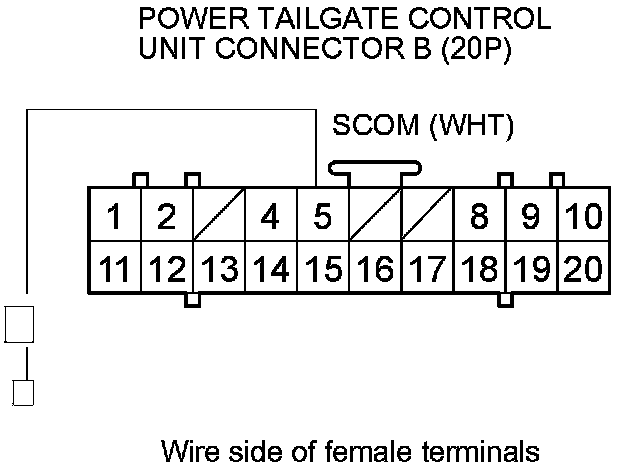 11. Check for continuity between power tailgate control unit connector B (20P) terminal No. 5 and body ground.